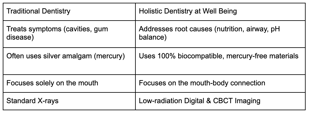 Traditional dentistry often functions as a "repair shop" for your teeth. In contrast, holistic dentistry views your oral health as a gateway to your overall wellness, ensuring that the treatments provided support your entire biological system.